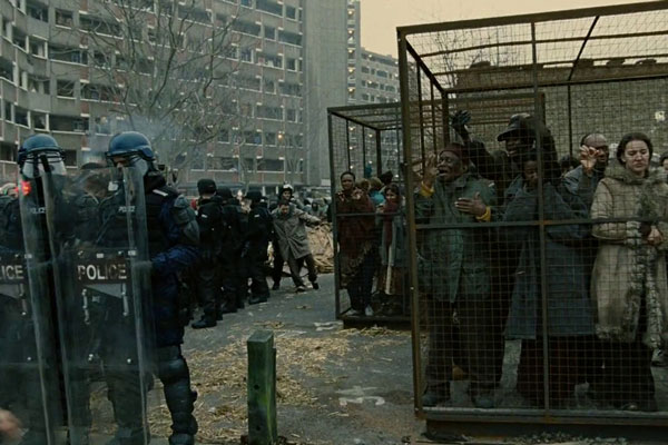Children of Men is rife with distinctively post-September 11 allusions: refugees kitted out in orange Guantanamo Bay-style jumpsuits, or cloaked in black in nightmarish homage to the notorious image of detainee Ali Shallal al-Qaisi, standing on a box, outstretched arms trailing wires primed to deliver electric shocks. And then there are the references to the passing of security bills à la the PATRIOT Act, and the visible Americanisation of the British state (‘Homeland Security’). But as potent and as damning as these signals are, it’s possible to see them now as largely reflexive; newspaper headlines jammed angrily into the frame. By contrast, the film’s depiction of the British Government’s horrific treatment of refugees looks to have been remarkably prescient.