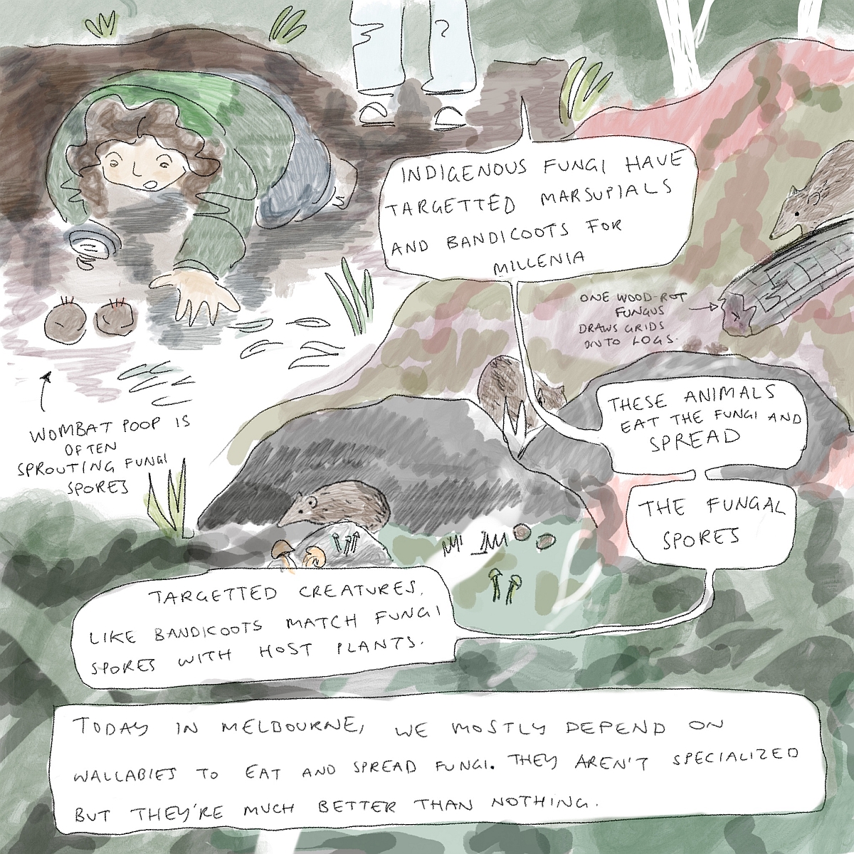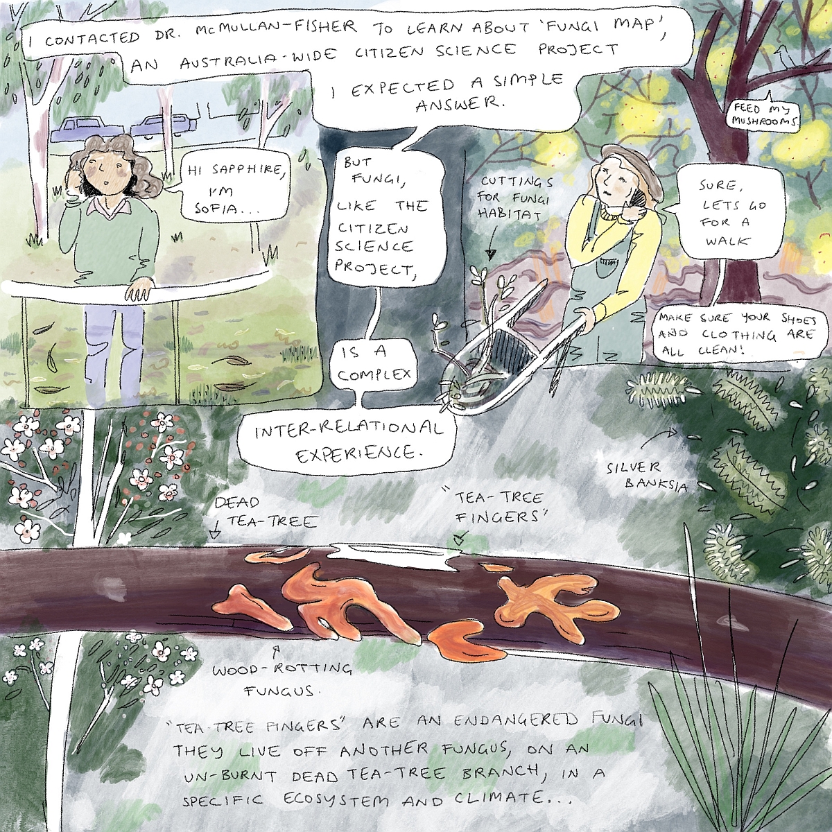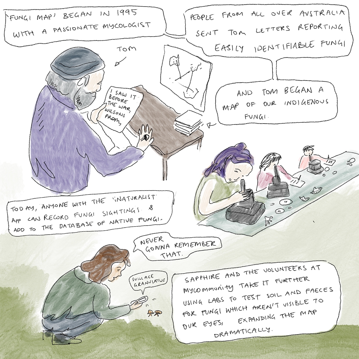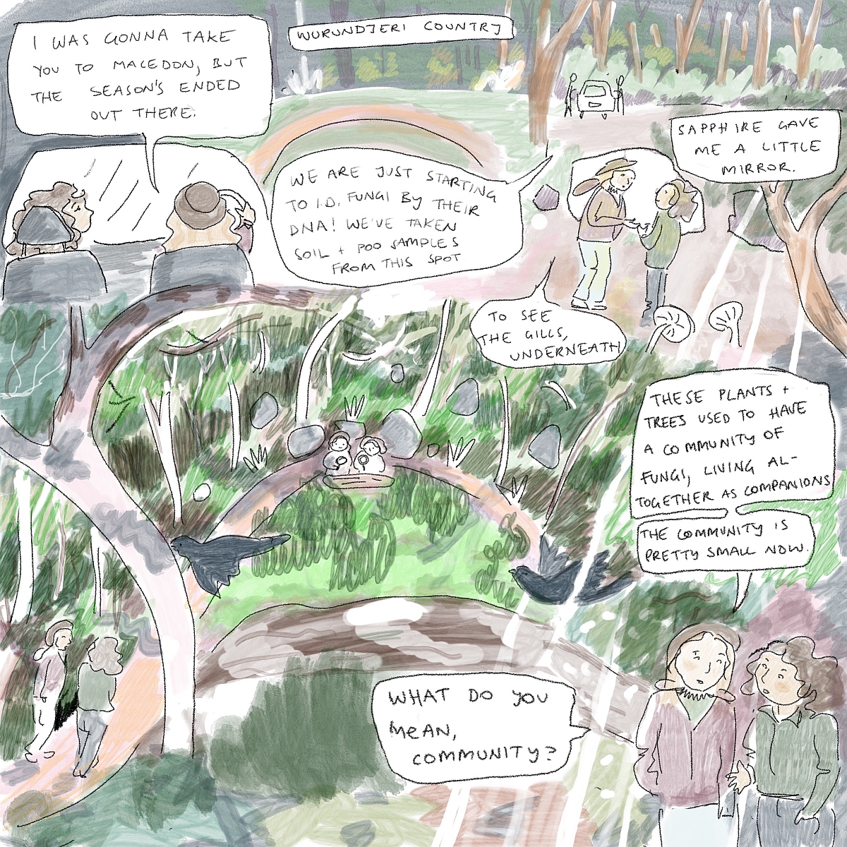 Published 17 April 202318 April 2023 · Cartoons / ecology A brief natural history of fungi in Australia Sofia Sabbagh Sofia Sabbagh Sofia Sabbagh is an illustrator and comic artist of Irish and Palestinian descent, based on stolen Wurundjeri land. More by Sofia Sabbagh › Overland is a not-for-profit magazine with a proud history of supporting writers, and publishing ideas and voices often excluded from other places. If you like this piece, or support Overland’s work in general, please subscribe or donate. Related articles & Essays 17 March 202617 March 2026 · ecology Carrying country – the unseen emotional labour of environmental defence Jens Kirsch Daniel Garlett is a Noongar cultural educator and community advocate who has spent decades opposing logging, mining, and large-scale land clearing in Western Australia’s forests and catchments. He lives here because he says he cannot live anywhere else. The quiet, the canopy, and the smell of damp earth after rain are not amenities. They are conditions of life. 6 March 202610 April 2026 · CoPower Trying really hard not to make a comic about critical minerals Sofia Sabbagh I'm trying really hard not to make a comic about critical minerals. 'Cos I know, my mum tells me, "it just doesn't resonate". Unless it's a personal story, critical minerals seem too far removed from our lives.