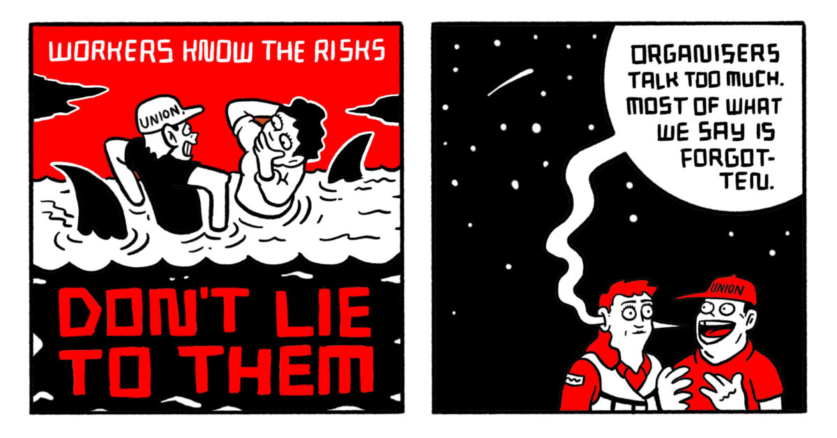 Published 12 April 202314 April 2023 · Cartoons / Unions Tips for rookie organisers Sam Wallman Sam Wallman Sam Wallman is a writer, illustrator and dockworker based on Wurundjeri country. You can follow his work here. More by Sam Wallman › Overland is a not-for-profit magazine with a proud history of supporting writers, and publishing ideas and voices often excluded from other places. If you like this piece, or support Overland’s work in general, please subscribe or donate. Related articles & Essays 7 April 20269 April 2026 · Unions Peering into the docks: a conversation with the Wharfies Mural Sam Wallman People are deeply curious about the docks. The port is right there, the cranes are giant shapes looming, so often visible, stretches of landscape inviting reflection and curiosity. But the docks are also completely inaccessible. They are non-spaces really, to most people. Exclusion zones. 6 March 202610 April 2026 · CoPower Trying really hard not to make a comic about critical minerals Sofia Sabbagh I'm trying really hard not to make a comic about critical minerals. 'Cos I know, my mum tells me, "it just doesn't resonate". Unless it's a personal story, critical minerals seem too far removed from our lives.