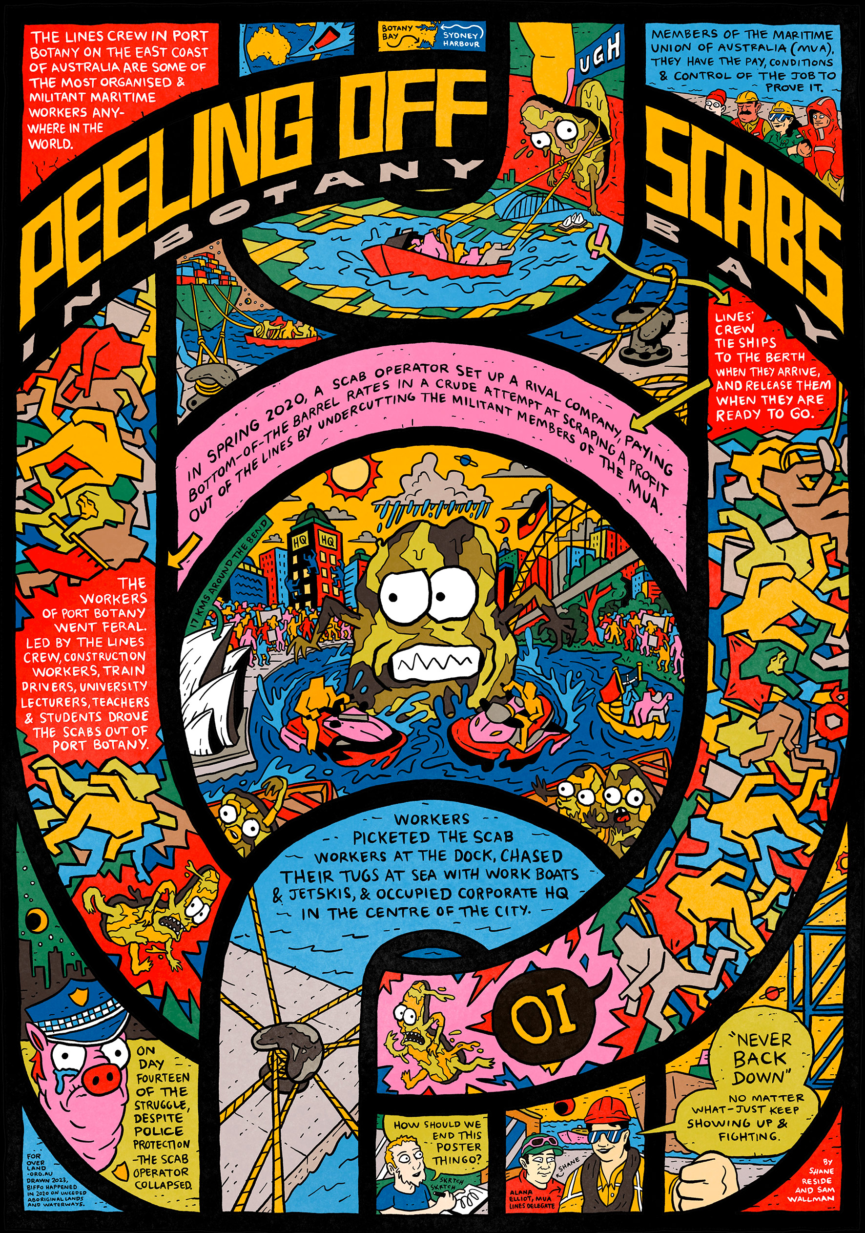Published 25 July 20238 August 2023 · Cartoons Peeling off scabs in Botany Bay Shane Reside and Sam Wallman Shane Reside Shane Reside is a union organiser and activist living in Sydney. More by Shane Reside › Sam Wallman Sam Wallman is a writer, illustrator and dockworker based on Wurundjeri country. You can follow his work here. More by Sam Wallman › Overland is a not-for-profit magazine with a proud history of supporting writers, and publishing ideas and voices often excluded from other places. If you like this piece, or support Overland’s work in general, please subscribe or donate. Related articles & Essays 6 March 202610 April 2026 · CoPower Trying really hard not to make a comic about critical minerals Sofia Sabbagh I'm trying really hard not to make a comic about critical minerals. 'Cos I know, my mum tells me, "it just doesn't resonate". Unless it's a personal story, critical minerals seem too far removed from our lives. 23 February 202623 February 2026 · Right to protest Colonial authoritarianism did not start with Chris Minns Eav Brennan On 10 February 2026, a crowd gathered a Surry Hills police station on Gadigal Country. It was a snap action to protest against the police brutality of the day before.