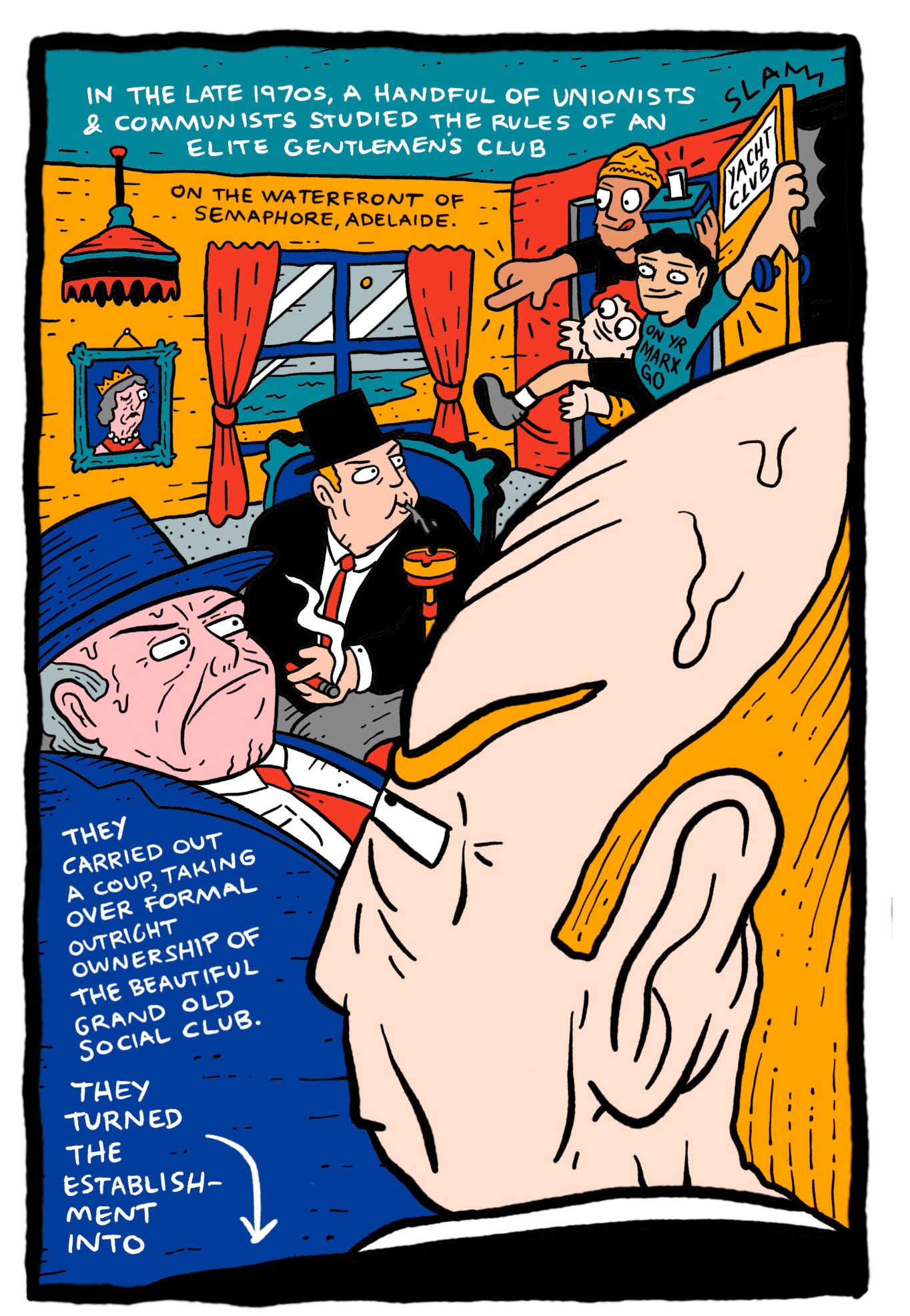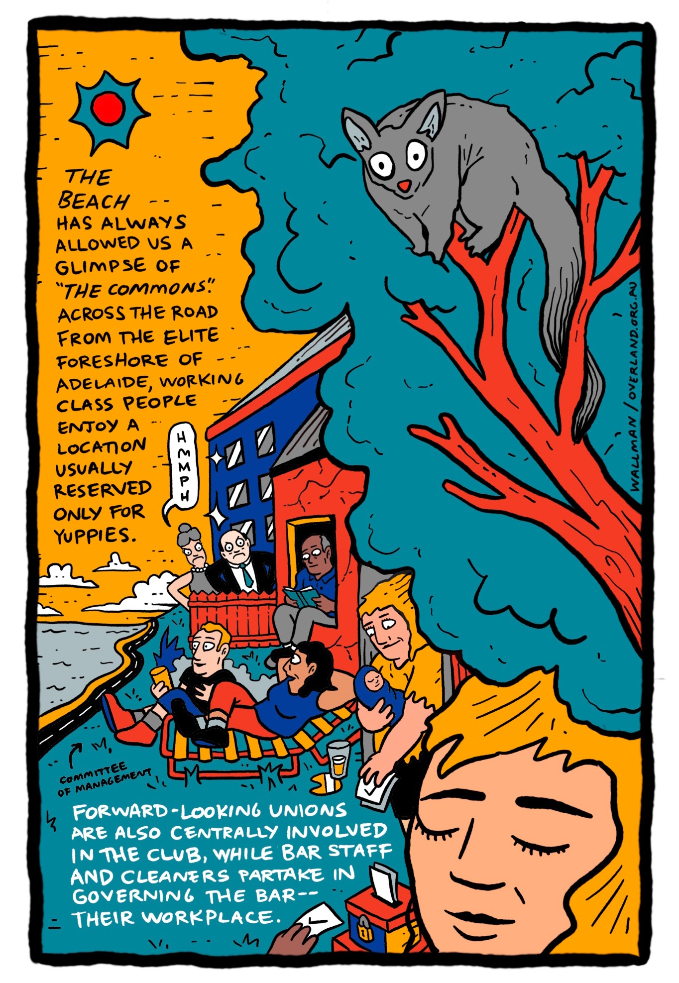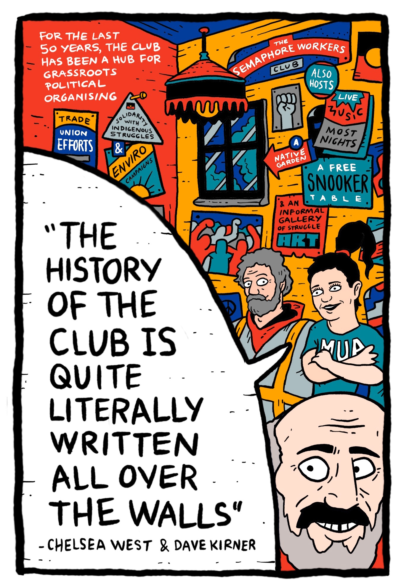 Published 8 November 20238 November 2023 · Cartoons / Workers' rights Peoples’ movements need physical spaces: the Semaphore Workers Club Sam Wallman Sam Wallman Sam Wallman is a writer, illustrator and dockworker based on Wurundjeri country. You can follow his work here. More by Sam Wallman › Overland is a not-for-profit magazine with a proud history of supporting writers, and publishing ideas and voices often excluded from other places. If you like this piece, or support Overland’s work in general, please subscribe or donate. Related articles & Essays 6 March 202610 April 2026 · CoPower Trying really hard not to make a comic about critical minerals Sofia Sabbagh I'm trying really hard not to make a comic about critical minerals. 'Cos I know, my mum tells me, "it just doesn't resonate". Unless it's a personal story, critical minerals seem too far removed from our lives. 23 February 202623 February 2026 · Right to protest Colonial authoritarianism did not start with Chris Minns Eav Brennan On 10 February 2026, a crowd gathered a Surry Hills police station on Gadigal Country. It was a snap action to protest against the police brutality of the day before.