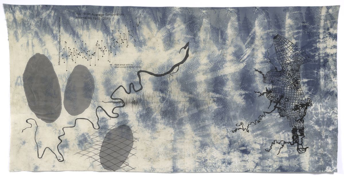 Published 11 April 202411 April 2024 · Art / Indigenous Australia Bathing in dinosaur water: Judy Watson at the Queensland Art Gallery Louise Martin-Chew Water is an elemental force that may be subtle or powerful, trickle gently, soothe or roar, and sweep all before it in a deadly trajectory. It comprises over ninety per cent of our bodies, and moves us, consciously or not, with the tides. For artist Judy Watson, water sits at the heart of her forty-year practice. It is her subject, material and inspiration. Watson harnesses and choreographs water, and has worked with its qualities since her beginnings as a printmaker. She then moved into pigment-soaked, layered canvases within which the viewer may drift amongst floating forms, part of a broader landscape and geography of belonging. Watson worked in this way even before she was aware of her connection to Waanyi Country in Queensland’s north-western Boodjamulla Lawn Hill Gorge, where she travelled in 1990, when she was thirty years old. Subterranean water bubbles to the surface in this place. It is ancient; she describes it as ‘dinosaur water’. The rainbow serpent, always present in the gorge, nurtures this place although, if the water is poisoned or dries up and she is forced to leave, the area will dry out, barren without its life-giving force. mudunama kundana wandaraba jarribirri / tomorrow the tree grows stronger opened on 23 March at the Queensland Art Gallery and is titled after a poem written in Waanyi language by Watson’s son, Otis Carmichael. It is Watson’s largest show, containing 120 works. Her fluid, unframed canvases line three galleries, steeped in watery pigment, created with paint and amorphous shapes, embedded by the dancing feet of her friends and family. They are seductively beautiful, with colours stained deep into their fabric, simmering with intensity, and are overlaid with translucent images — shells, shapes, markings, heads of people and animals — that float out and into a viewer’s consciousness. But they also pack a punch, with a commitment to expressing often uncomfortable truths. Watson draws from her identity and family histories with stories of universal dispossession, environmental awareness, feminism, and a sense of simmering injustice about the Indigenous materials that remain in the archive, collected without permission. The canvases line spaces that also include her prints, films, sculpture and references to the art she has made for public places. Each of the exhibition’s three areas are situated within and adjacent to the Queensland Art Gallery’s water mall. This space was designed in 1982 by architect Robin Gibson to broadcast the Queensland light, with vistas to the adjacent Brisbane River/Maiwar, which winds, a huge brown serpent, through the city. The water mall echoes and amplifies Watson’s work, as her work does this space. The architecture was designed to democratise access to art for everybody. Equally, Watson’s impetus since the beginning of her career has been to bridge the divide between Indigenous and non-Indigenous peoples. Watson came early to a way of art-making for urban-based Indigenous artists, a mode that delivered political truths as integral to an aesthetic. Such avenues are taught at university now, and are well understood, but for Watson and some of her contemporaries — notably Tracey Moffatt (born 1960), Gordon Bennett (1955-2014), and Fiona Foley (born 1964) — forty years ago, it was necessary to blaze this trail. In the 1980s it was art from the desert which was sought after. Now Watson is recognised as one of Australia’s most significant voices, having received the most prestigious awards available to contemporary artists. These include representing Australia at the 1997 Venice Bienniale (with Emily Kame Kngwarreye and Yvonne Koolmatrie) and winning the Clemenger Award (presented by the National Gallery of Victoria) in 2006. What is remarkable, when considering Watson’s work since the 1980s is the consistency of her motifs, and the commitment she exhibited so early in her practice. In the intervening decades, many truth-tellers have emerged amongst the newer generations, but Watson’s journey has an emotional impct — its aesthetic seductive yet indelibly leaching its stories in a manner informed by science, ecology, feminism and the archive. As Ted Snell writes, “That sense of humility and her determination to make a difference within a community remain as core principles in her work.”[1] The impact on the earth of a changing climate is conveyed in a manner that weeps its grief through graphs of landscapes, filtered into work that narrates its meaning with titles, like spot fires, our country is burning now (2020). In three dimensions we bump up against horrific stories, conveyed with a particular touch. 40 pairs of blackfellows’ ears, lawn hill station (2018) illustrates a narrative from the archive, Aboriginal ears cast and pinned to the wall; these might well have included her own ancestors. The prints tell other family stories of injustice and sadness, like her artist book under the act (2007) which draws on letters written to Queensland’s Chief Protector of Aborigines for permission to marry. Waston has witnessed and documented Indigenous objects seen in international museums removed from communities, leading to the works our skin in your collections, our bones in your collections and our hair in your collections (all 1997). These may be uncomfortable histories, but the way Watson gently, indelibly, conveys her message through an aesthetic that is beautiful, while speaking to the water in our own bodies, makes an emotional swell that is truly masterful. Like all of Watson’s enterprises, the exhibition is a joint effort involving friends, family, and colleagues, always becoming more than the sum of its parts. There is poetry here, from Otis’s title, in the titles of the works (Watson’s words that trickle out over the walls)