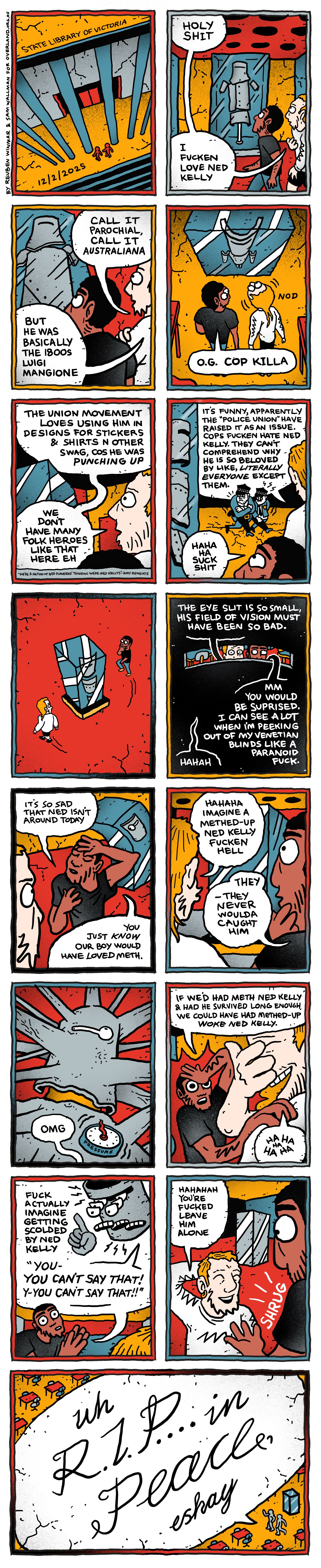 Published 3 March 20255 March 2025 · Cartoons RIP woke, methed-up Ned Kelly Sam Wallman and Reuben Winmar Sam Wallman Sam Wallman is a writer, illustrator and dockworker based on Wurundjeri country. You can follow his work here. More by Sam Wallman › Reuben Winmar Reuben Winmar is a Yorta Yorta man and emerging writer based in Melbourne. More by Reuben Winmar › Overland is a not-for-profit magazine with a proud history of supporting writers, and publishing ideas and voices often excluded from other places. If you like this piece, or support Overland’s work in general, please subscribe or donate. Related articles & Essays 6 March 202610 April 2026 · CoPower Trying really hard not to make a comic about critical minerals Sofia Sabbagh I'm trying really hard not to make a comic about critical minerals. 'Cos I know, my mum tells me, "it just doesn't resonate". Unless it's a personal story, critical minerals seem too far removed from our lives. 23 February 202623 February 2026 · Right to protest Colonial authoritarianism did not start with Chris Minns Eav Brennan On 10 February 2026, a crowd gathered a Surry Hills police station on Gadigal Country. It was a snap action to protest against the police brutality of the day before.