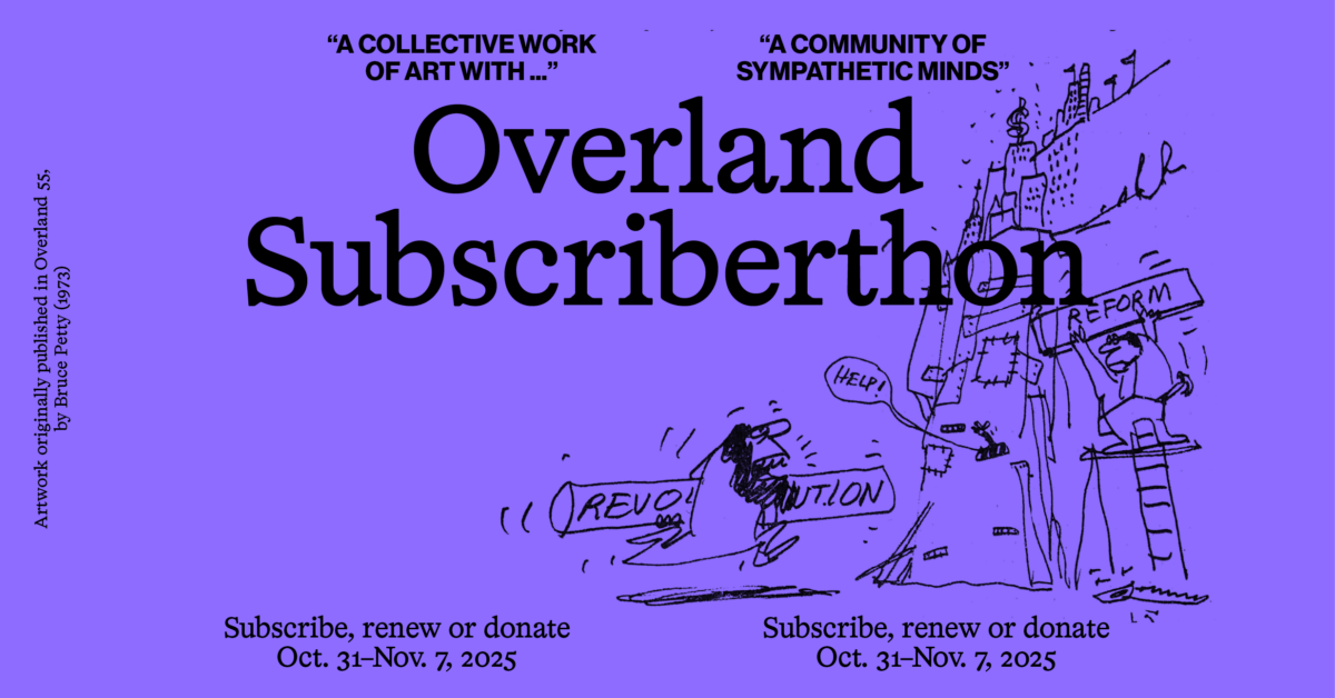 Published 30 October 202531 October 2025 · Main Posts Overland’s 2025 Subscriberthon! Editorial team Overland‘s Subscriberthon is back for another year, and we have so much to give you! So if you’ve been thinking of subscribing, renewing or gifting a subscription – do it now between October 31 – November 7! The Literary Journals in Australia report commissioned by Creative Australia last year emphasized two overwhelming points: that literary journals like Overland are indispensable to the formal richness and political diversity of Australian writing, and that they are radically unsustainable under current funding arrangements. The catastrophically myopic closure of our sister journal Meanjin last month has since tragically borne out that verdict. In subscribing to Overland you’re ensuring priceless opportunities and spaces for writers in a narrowing literary ecology, and a space of critical independence in a mediascape increasingly dominated by vested interest. Over on our main page and our socials, we’ve got a stacked week ahead of incredible fiction, poetry, art and nonfiction in store, courtesy of our treasured NZ-based online editor Giovanni Tiso. We’re honoured to be able to showcase the brave, unrelenting work of the writers, academics, activists, organisers, unionists and artists in our community. So, how does it work? From Friday 31 October to Friday 7 November, subscribe, renew, or donate over $40 for your chance to win. Your name will instantly go into three prize draws for triple the luck: a daily prize draw, a regional prize draw and a major prize draw! You’re not gonna want to miss out on your chance to win this year’s prizes, which include: A 5-night retreat at Wombat Bend (Yarra Valley), plus a $500 stipend from Overland to cover transport and food costs A full set of all five of our beautiful Overland prints A hamper from Chinese tea shop Kurra Corp Dance and drumming class vouchers from Melbourne Djembe Subscriptions to Australian Book Review, Griffith Review, Island, Kill Your Darlings, and Voiceworks and more Book packs from our kind friends at Giramondo, Fremantle Press, University of Queensland Press (UQP), Subbed In, Transit Lounge, Monash University Press, Hachette and more … and loads more! To join us in celebrating 71 years of radical literature (and to win some prizes while you’re at it), go to overland.org.au/shop or overland.org.au/donate between October 31 to November 7 and subscribe, renew or donate! Speaking of prizes, we are extremely thankful to our generous friends and supporters who made this year’s Subscriberthon possible! Read about them and their work here. Major prize I What’s in this major prize? Click here to learn more about Wombat Bend. Major prize II What’s in this major prize? Daily prizes FRIDAY 31 OCTOBER What’s in this prize? THE WEEKEND 1 & 2 NOVEMBER What’s in this prize? MONDAY 3 NOVEMBER What’s in this prize? TUESDAY 4 NOVEMBER What’s in this prize? WEDNESDAY 5 NOVEMBER What’s in this prize? THURSDAY 6 NOVEMBER What’s in this prize? FINAL DAY: FRIDAY 7 NOVEMBER What’s in this prize? TAKE ME TO THE SUBSCRIPTION OPTIONS! Editorial team More by Editorial team › Overland is a not-for-profit magazine with a proud history of supporting writers, and publishing ideas and voices often excluded from other places. If you like this piece, or support Overland’s work in general, please subscribe or donate. Related articles & Essays 20 March 20262 April 2026 · Main Posts Final results of the 2025 Judith Wright Poetry Prize Editorial team Established in 2007 and supported by the Malcolm Robertson Foundation, the Overland Judith Wright Poetry Prize seeks outstanding poetry from new and emerging writers. This year’s judges, Shastra Deo, Harry Reid and […] 20 March 202620 March 2026 · Main Posts Final results of the 2025 Neilma Sidney Short Story Prize Editorial team Established in 2007 and supported by the Malcolm Robertson Foundation, the Overland Neilma Sidney Short Story Prize seeks outstanding original short fiction of up to 3000 words themed loosely around the notion […]