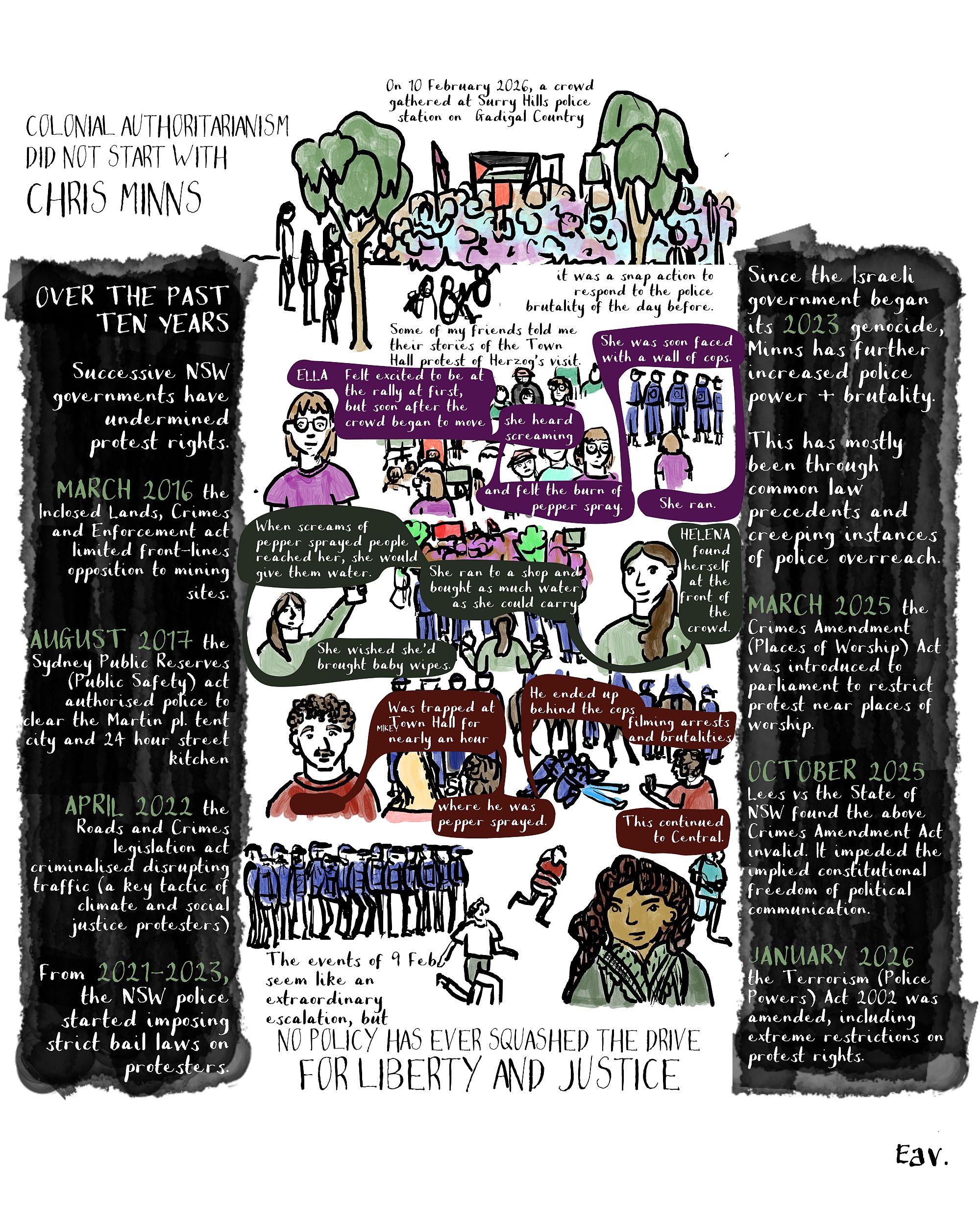 Published 23 February 202623 February 2026 · Right to protest / Cartoons Colonial authoritarianism did not start with Chris Minns Eav Brennan Eav Brennan Eav Brennan (she/her) is an environmental educator and comics artist who is a settler on Gadigal Country. Her first book, Graphic Ecology, a comic essay about visualising ecological ideas which she co-authored with Dr Caitlyn Forster, was published in 2024. In her book-making practice, she makes her own paints and inks and loves collaging. More by Eav Brennan › Overland is a not-for-profit magazine with a proud history of supporting writers, and publishing ideas and voices often excluded from other places. If you like this piece, or support Overland’s work in general, please subscribe or donate. Related articles & Essays 30 March 202630 March 2026 · Right to protest Conditions regarding protests: a response to the University of Melbourne Jeff Sparrow What has been done cannot be undone. But a reversal of the current descent into barbarism begins with justice for Gaza. The University of Melbourne still has an opportunity to speak out against genocide and apartheid. It should do so. 6 March 202610 April 2026 · CoPower Trying really hard not to make a comic about critical minerals Sofia Sabbagh I'm trying really hard not to make a comic about critical minerals. 'Cos I know, my mum tells me, "it just doesn't resonate". Unless it's a personal story, critical minerals seem too far removed from our lives.