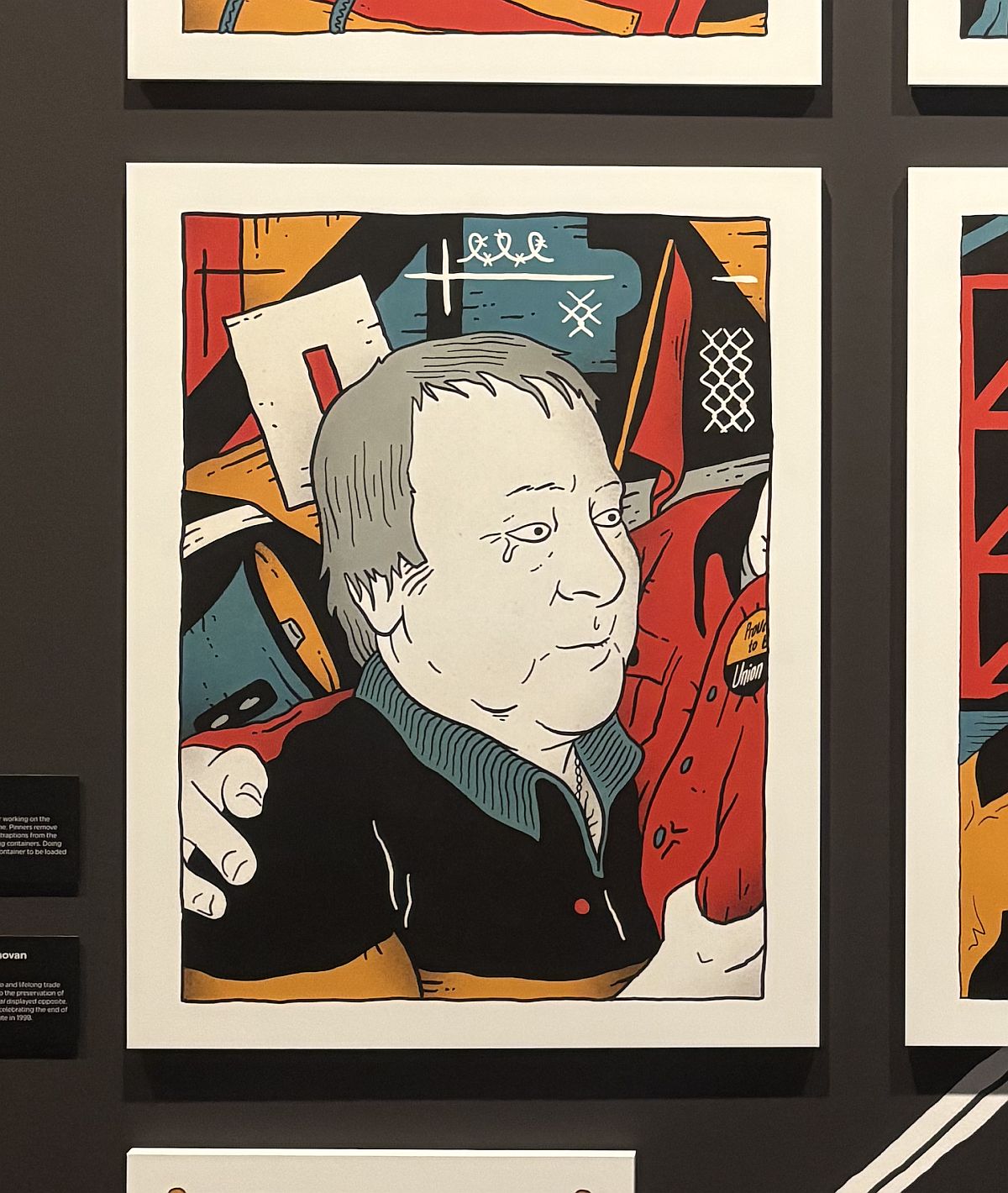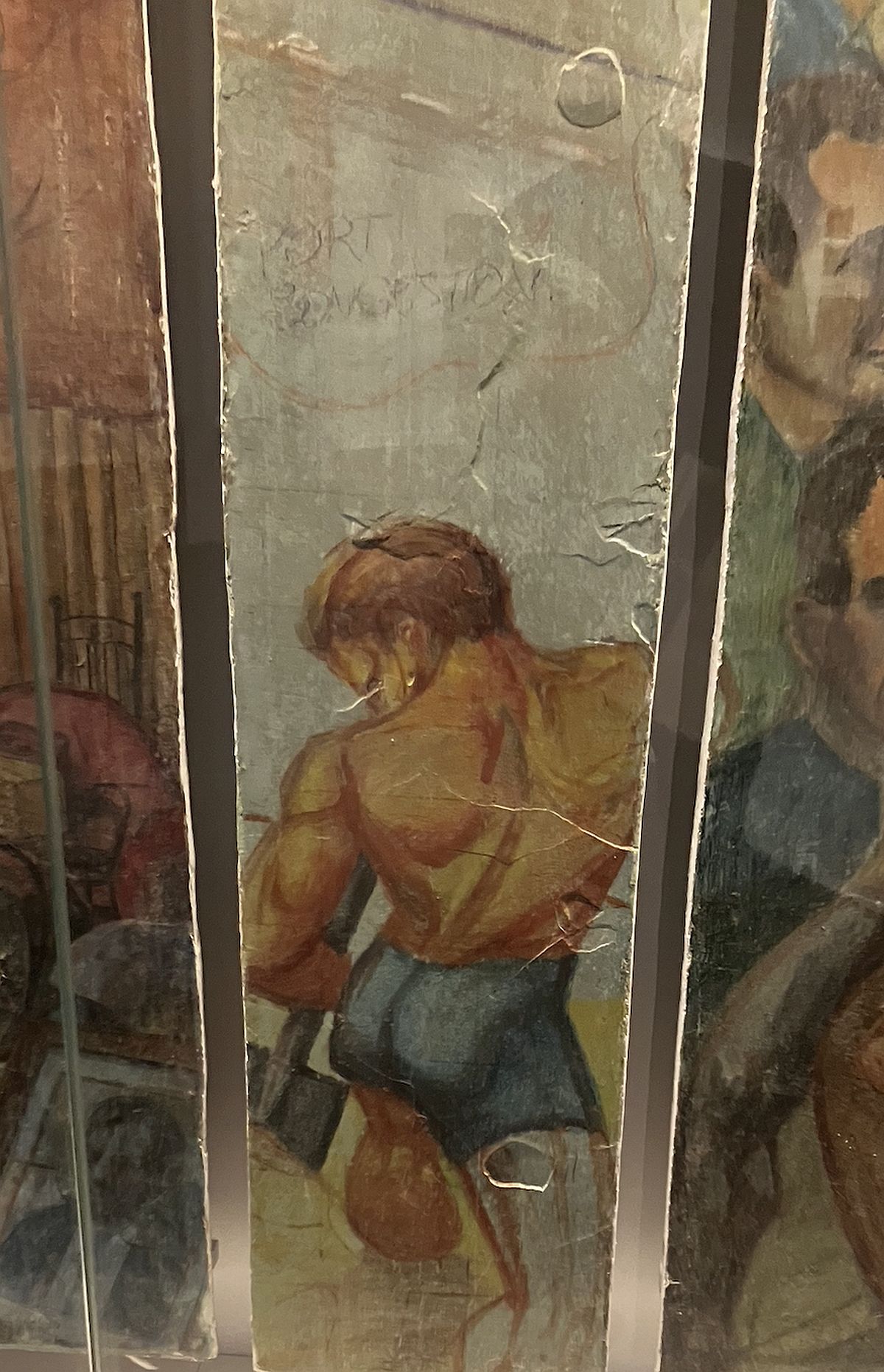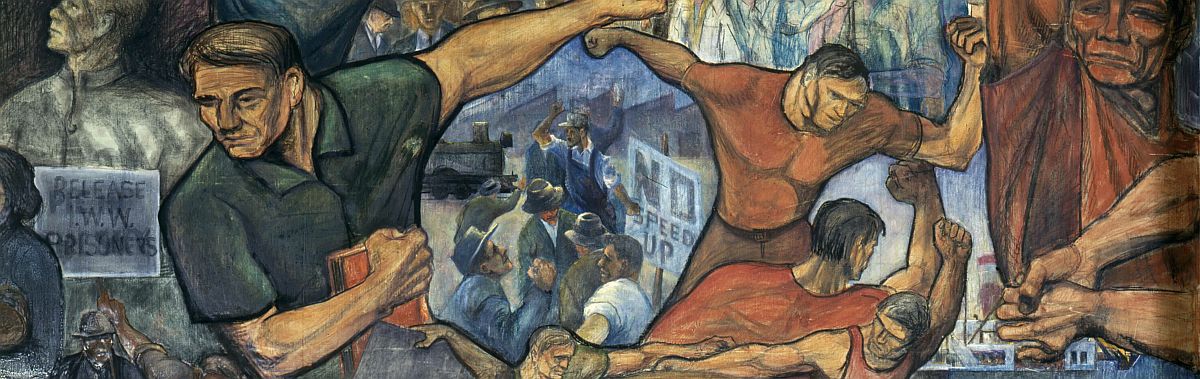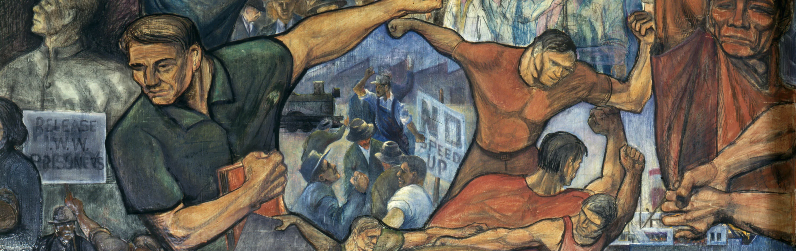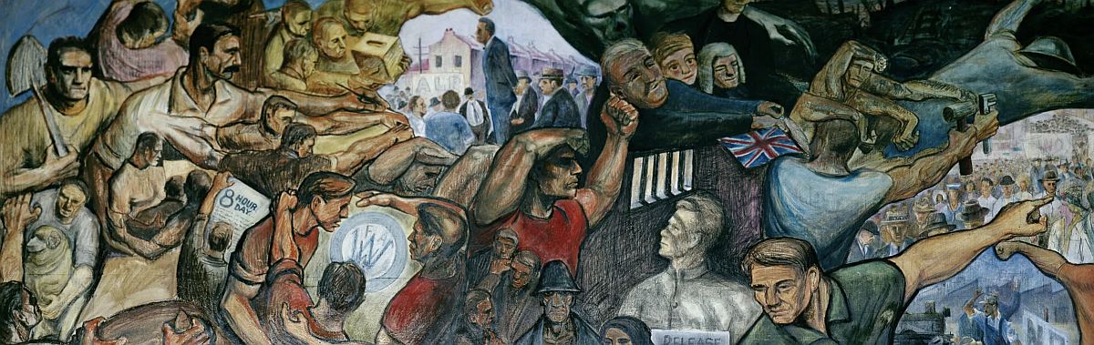 Published 7 April 20269 April 2026 · Unions / History of the Left Peering into the docks: a conversation with the Wharfies Mural Sam Wallman The following is a lightly edited transcript of the talk Sam gave at the Australian National Maritime Museum on Thursday 4 December 2025, to launch his exhibition “View from the Docks”. Sam’s exhibit sits directly opposite the historic “Wharfies Mural”, the main focus of the talk. The exhibition is running for a few more months and entry is free, so please go and check it out. The Australian National Maritime Museum is located at 2 Murray street, Darling Harbour, Sydney, Gadigal Country. People are deeply curious about the docks. The port is right there, the cranes are giant shapes looming, so often visible, stretches of landscape inviting reflection and curiosity. But the docks are also completely inaccessible. They are non-spaces really, to most people. Exclusion zones. There are other reasons the docks are compelling to people — any job that features in Lego land or other kids’ toys draws a simple kind of curiosity. Dock work also seems like “real work”, at odds with other, more abstracted labour. But make no mistake, wharfies are also alienated from their labour. Alienated as fuck. There is a certain romanticisation of maritime industries. I would argue that this romanticisation is often misplaced, as well as outmoded. I can’t say for sure, but I think when people picture life on the docks, they might be picturing a different waterfront, one from a bygone era. Every shift, we see punters peering through the cyclone fencing that locks us inside the terminal. So, for better or worse, people are curious about places they can’t see. “Black box sites”, as my architect friend calls them. These kinds of places are also where some of the best art comes from, in my opinion. Art helps people peer into the docks. But it also helps the people at the wharves to see themselves, which I think can be an important thing. Art also helps articulate our political struggles, which are in reality largely invisible. That is the challenge of the artist who is concerned with struggle: to make manifest power relations, social relations, amorphous shape-shifting dynamics. Things that cannot be seen with the human eye. How would you paint your relationship with your boss, for instance? That’s an invisible thing. How would you draw your relationship with the means of production? You kind of can’t. But politically engaged artists attempt to do this impossible thing, in order to bring people into the fight, and to capture the beauty of the fight. Because it is beautiful, and there is meaning in this kind of life. Thankfully, new people are always coming up, and coming into this movement, all of the time. So you have to constantly say the same things, over and over again. We also make art so that, hopefully, workers in the future will remember the things that we think are important. The Sydney branch of the Maritime Union of Australia is arguably the nucleus of the oldest wharfie union on planet Earth, having been founded in 1872 in a pub in the waterside suburb of The Rocks, not far from where the Sydney Opera House was built one hundred years later. The Sydney branch of the MUA has long been the most militant and creative branch of any trade union in this country, in my opinion. It remains to this day remarkably staunch, and also communist-led — the only branch of any trade union in this country that can still boast that. The MUA has long understood that industrial struggle doesn’t end with wages and conditions, and that our unions are a way to manifest democracy en masse. Unionism is democracy replicated a thousand times over. In the 1950s, around the time that wharfies started painting the above mural, union leader and militant commie Tom Nelson wrote this about the previous decade or so: with the shorter working day and the development of action against the owners, came a great upsurge of activity. Various sporting bodies came into existence. A movie film group to entertain members was established. A unit to produce plays, and songs of the struggles and… ambitions of the union was encouraged. Thus we began to sever our dependence on the boss for his culture and entertainment. This period has been largely preoccupied with the struggle against the ruling class, whose ambitions were to drive us back. So this is seventy or so years ago. My dear friend Rosie sent me this quote from the book Wharfies: The history of the waterside workers federation by Margo Beasley. Turns out I was absolutely not the first struggling artist to find themselves working on the docks. Actually, I think it might be a bit of an archetype: Perhaps the most exceptional developments in this period were the artistic activities fostered in Sydney Branch. They were aided by the actors, artists, film makers, musicians, poets and writers who, unable to make a living at their chosen professions, found themselves in wharf labourers’ ranks. Sydney Branch headquarters in Sussex Street was extensively remodelled in 1951 and 1952 to provide a canteen, art studio, hall, facilities for film production and musical performance, a library and a reading room. [My emphasis.] This building [the new maritime union headquarters] also housed the New Theatre for several years. An art group, through which lessons were conducted at night for wharfies and on weekends for children, was established by artists… Banners on contemporary political and industrial issues were produced in the studio for May Day marches and demonstrations… The establishment of the innovative Waterside Workers’ Film Unit was recognition by the branch leadership of the importance of cinema as both an art form and a communication medium… (The film unit is still going to this day, remarkably, and even recorded this lecture the night it was delivered.) Playwrights and actors also used to produce politically educat
