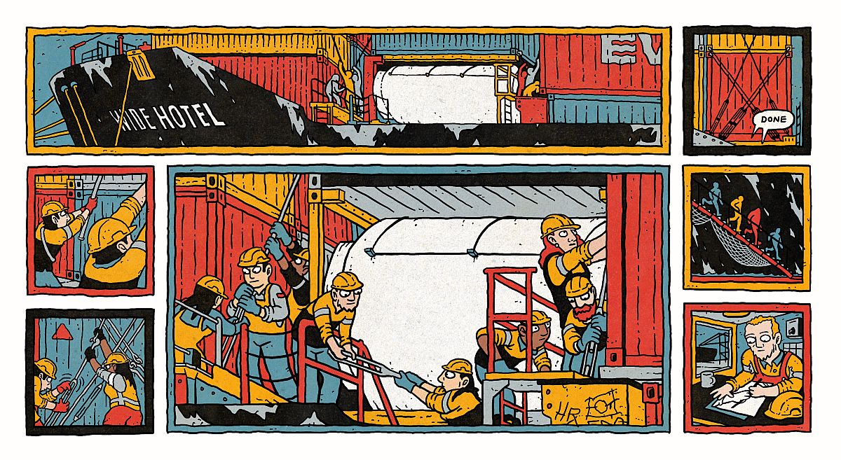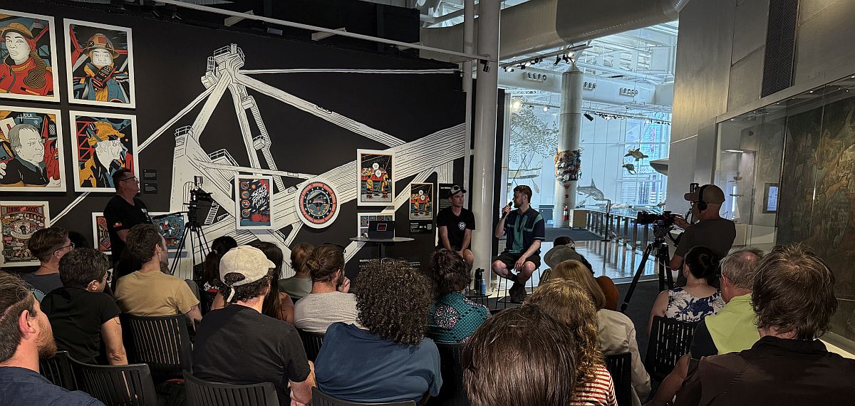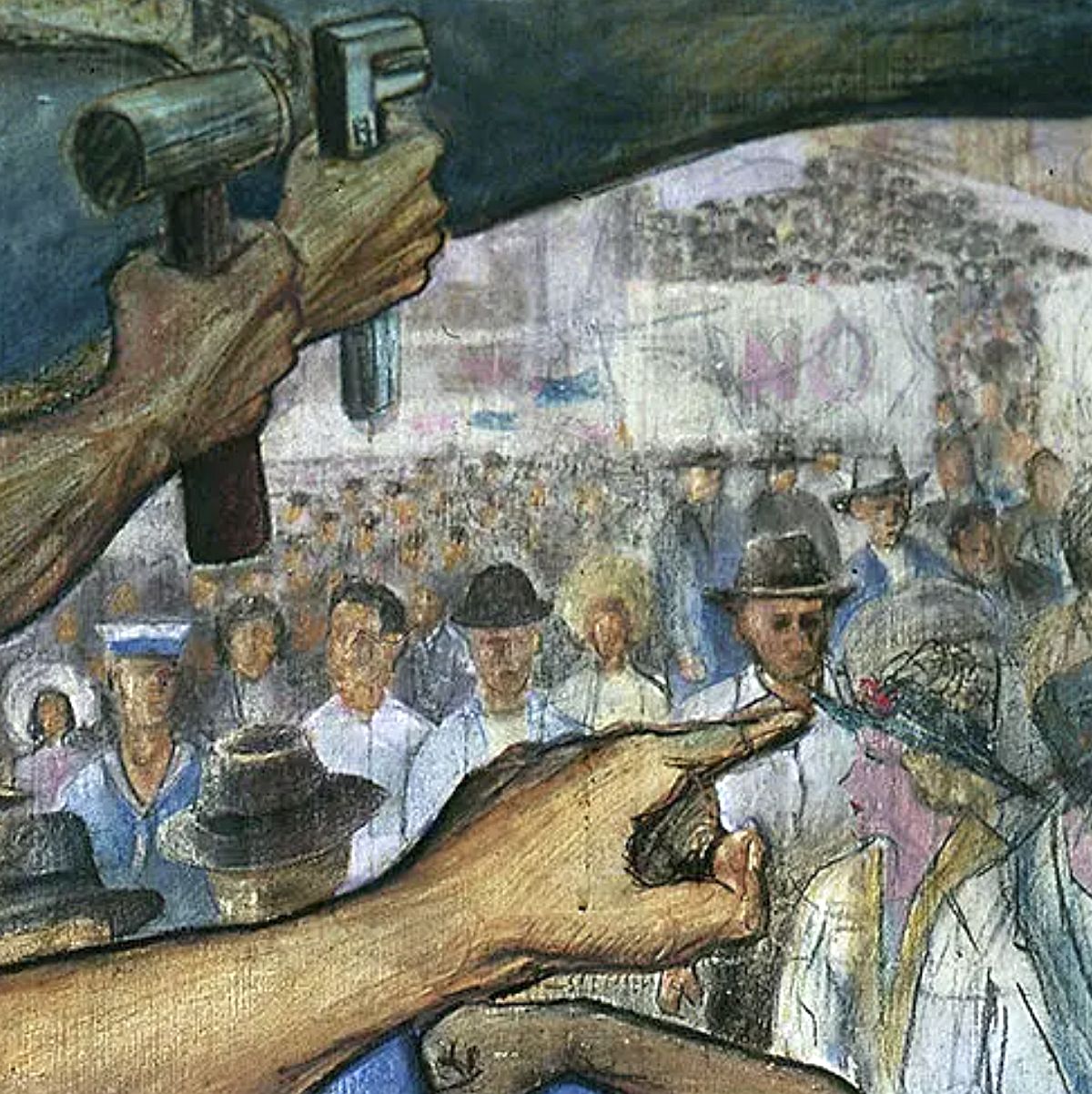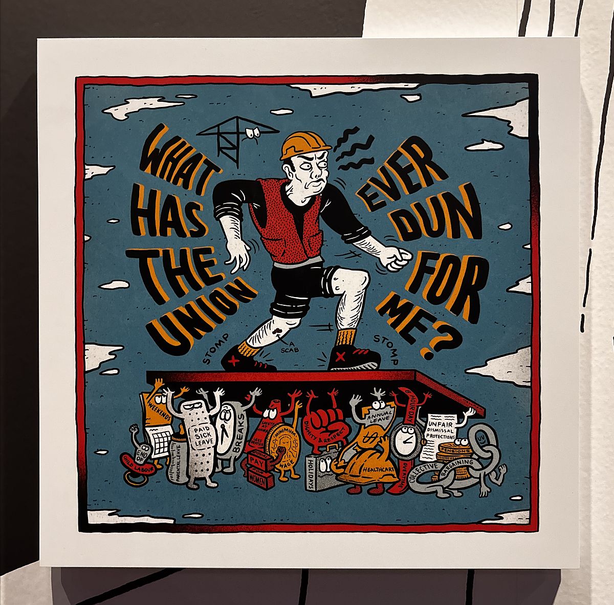 Published 7 April 20269 April 2026 · Unions / History of the Left Peering into the docks: a conversation with the Wharfies Mural Sam Wallman The following is a lightly edited transcript of the talk Sam gave at the Australian National Maritime Museum on Thursday 4 December 2025, to launch his exhibition “View from the Docks”. Sam’s exhibit sits directly opposite the historic “Wharfies Mural”, the main focus of the talk. The exhibition is running for a few more months and entry is free, so please go and check it out. The Australian National Maritime Museum is located at 2 Murray street, Darling Harbour, Sydney, Gadigal Country. People are deeply curious about the docks. The port is right there, the cranes are giant shapes looming, so often visible, stretches of landscape inviting reflection and curiosity. But the docks are also completely inaccessible. They are non-spaces really, to most people. Exclusion zones. There are other reasons the docks are compelling to people — any job that features in Lego land or other kids’ toys draws a simple kind of curiosity. Dock work also seems like “real work”, at odds with other, more abstracted labour. But make no mistake, wharfies are also alienated from their labour. Alienated as fuck. There is a certain romanticisation of maritime industries. I would argue that this romanticisation is often misplaced, as well as outmoded. I can’t say for sure, but I think when people picture life on the docks, they might be picturing a different waterfront, one from a bygone era. Every shift, we see punters peering through the cyclone fencing that locks us inside the terminal. So, for better or worse, people are curious about places they can’t see. “Black box sites”, as my architect friend calls them. These kinds of places are also where some of the best art comes from, in my opinion. Art helps people peer into the docks. But it also helps the people at the wharves to see themselves, which I think can be an important thing. Art also helps articulate our political struggles, which are in reality largely invisible. That is the challenge of the artist who is concerned with struggle: to make manifest power relations, social relations, amorphous shape-shifting dynamics. Things that cannot be seen with the human eye. How would you paint your relationship with your boss, for instance? That’s an invisible thing. How would you draw your relationship with the means of production? You kind of can’t. But politically engaged artists attempt to do this impossible thing, in order to bring people into the fight, and to capture the beauty of the fight. Because it is beautiful, and there is meaning in this kind of life. Thankfully, new people are always coming up, and coming into this movement, all of the time. So you have to constantly say the same things, over and over again. We also make art so that, hopefully, workers in the future will remember the things that we think are important. The Sydney branch of the Maritime Union of Australia is arguably the nucleus of the oldest wharfie union on planet Earth, having been founded in 1872 in a pub in the waterside suburb of The Rocks, not far from where the Sydney Opera House was built one hundred years later. The Sydney branch of the MUA has long been the most militant and creative branch of any trade union in this country, in my opinion. It remains to this day remarkably staunch, and also communist-led — the only branch of any trade union in this country that can still boast that. The MUA has long understood that industrial struggle doesn’t end with wages and conditions, and that our unions are a way to manifest democracy en masse. Unionism is democracy replicated a thousand times over. In the 1950s, around the time that wharfies started painting the above mural, union leader and militant commie Tom Nelson wrote this about the previous decade or so: with the shorter working day and the development of action against the owners, came a great upsurge of activity. Various sporting bodies came into existence. A movie film group to entertain members was established. A unit to produce plays, and songs of the struggles and… ambitions of the union was encouraged. Thus we began to sever our dependence on the boss for his culture and entertainment. This period has been largely preoccupied with the struggle against the ruling class, whose ambitions were to drive us back. So this is seventy or so years ago. My dear friend Rosie sent me this quote from the book Wharfies: The history of the waterside workers federation by Margo Beasley. Turns out I was absolutely not the first struggling artist to find themselves working on the docks. Actually, I think it might be a bit of an archetype: Perhaps the most exceptional developments in this period were the artistic activities fostered in Sydney Branch. They were aided by the actors, artists, film makers, musicians, poets and writers who, unable to make a living at their chosen professions, found themselves in wharf labourers’ ranks. Sydney Branch headquarters in Sussex Street was extensively remodelled in 1951 and 1952 to provide a canteen, art studio, hall, facilities for film production and musical performance, a library and a reading room. [My emphasis.] This building [the new maritime union headquarters] also housed the New Theatre for several years. An art group, through which lessons were conducted at night for wharfies and on weekends for children, was established by artists… Banners on contemporary political and industrial issues were produced in the studio for May Day marches and demonstrations… The establishment of the innovative Waterside Workers’ Film Unit was recognition by the branch leadership of the importance of cinema as both an art form and a communication medium… (The film unit is still going to this day, remarkably, and even recorded this lecture the night it was delivered.) Playwrights and actors also used to produce politically educat