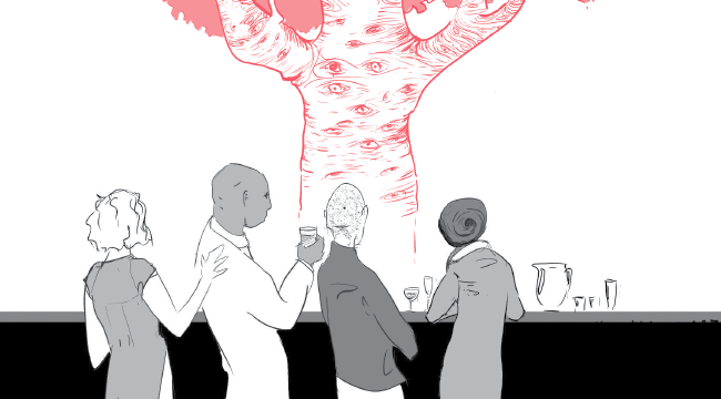 It’s still early, and a weeknight. The bar is almost empty, and quiet but for their voices and the voices at another table, farther away. The figures at the second table are murky silhouettes, as is the barman, distant from here. She watches as he collects emptied beer jugs, and hears the sound of glass against glass as their sides knock together.