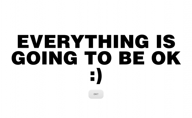 Author note: ‘Everything is Going To Be OK :)’ is a dialogue in five scenes which is generated from fragments of conversations sourced from Twitter. Each time it is run it is different, and it is different for every reader.